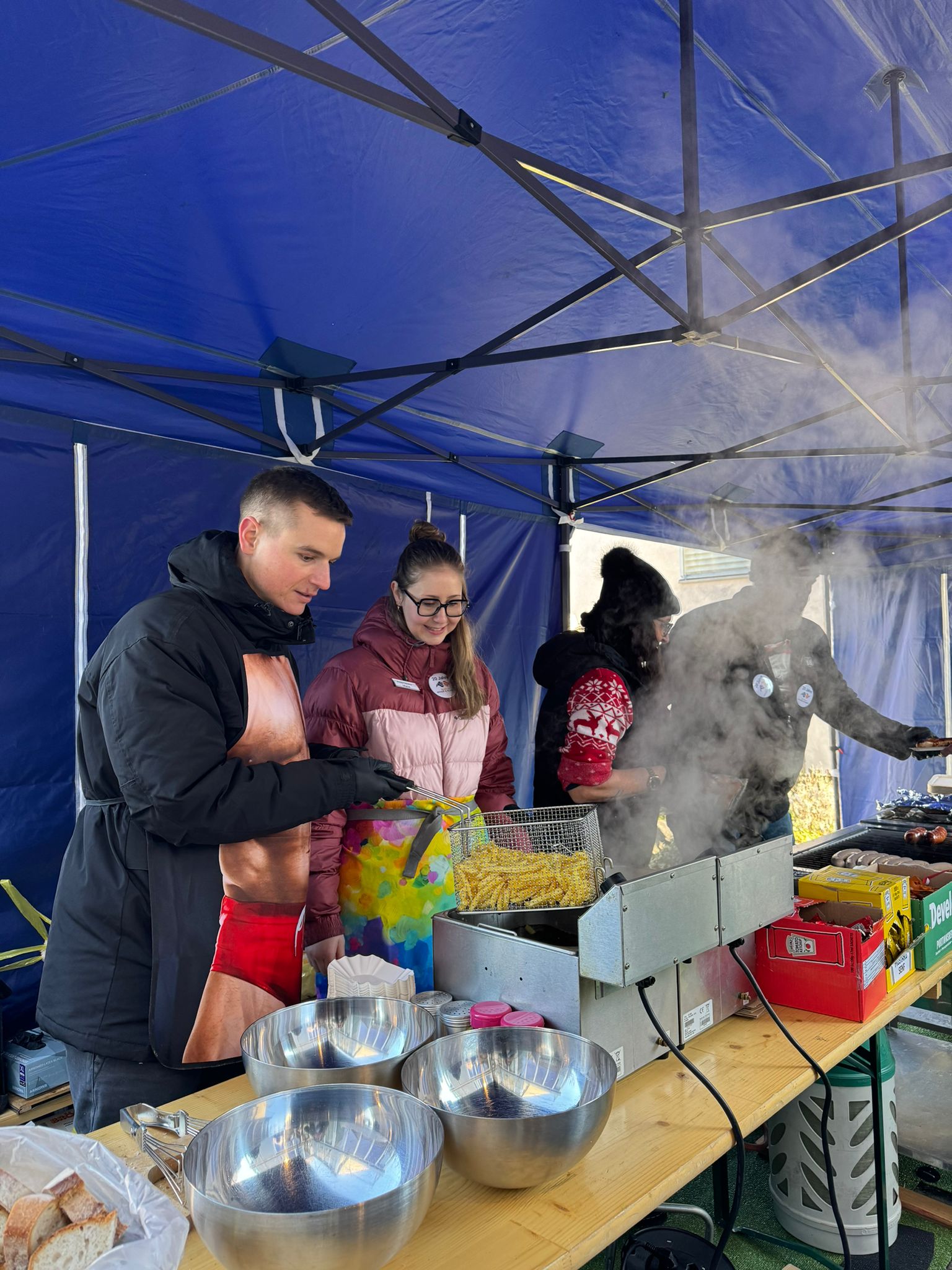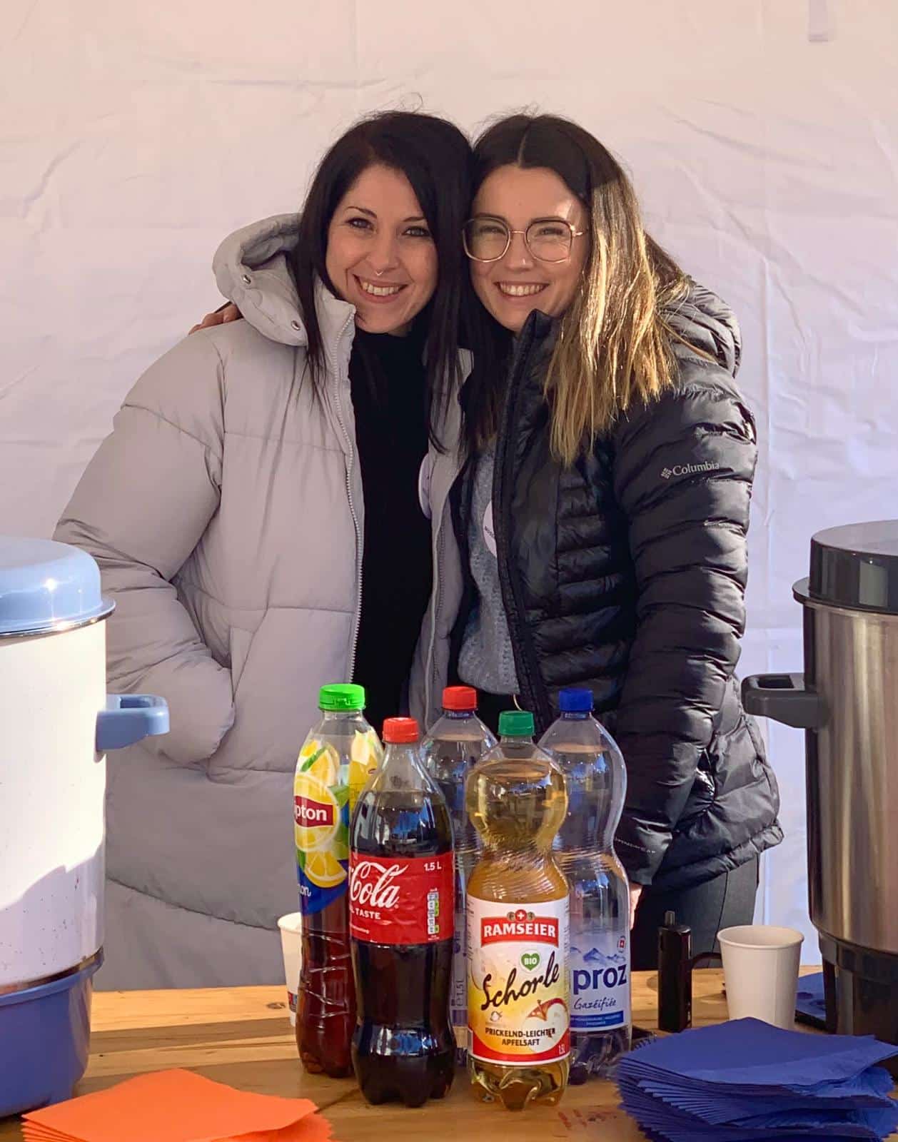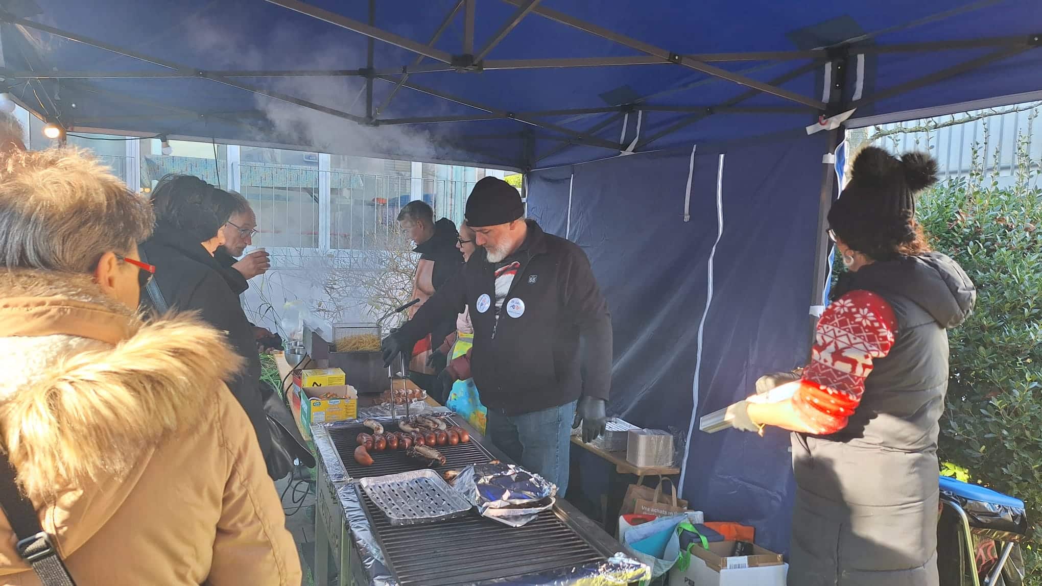 180 Klöpfer, 180 Bratwürste, 30 vegane Würste, 40kg Pommes, 20kg Brot und 75 Liter Glühwein standen parat. Zudem konnten wir ein imposantes Kuchenbuffet präsentieren: über 25 selbstgemachte Kuchen, Wähen und andere süsse Leckereien wurden von unseren Mitarbeitenden mitgebracht.