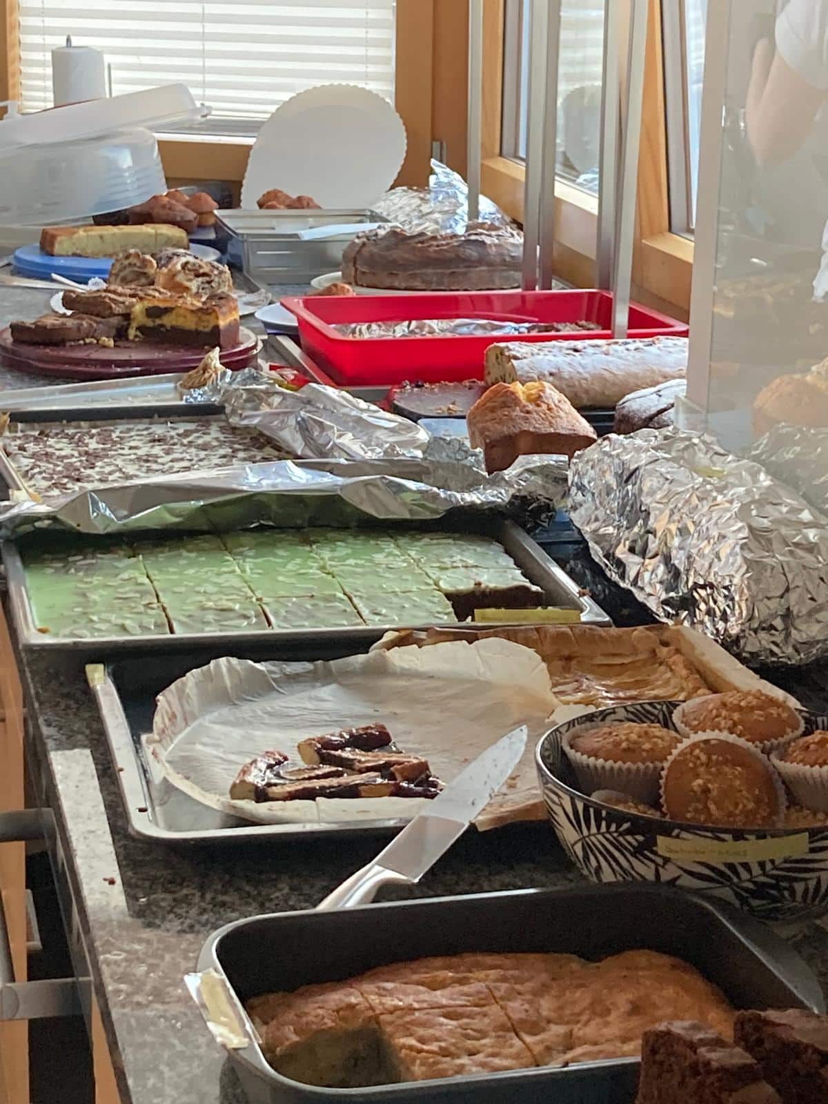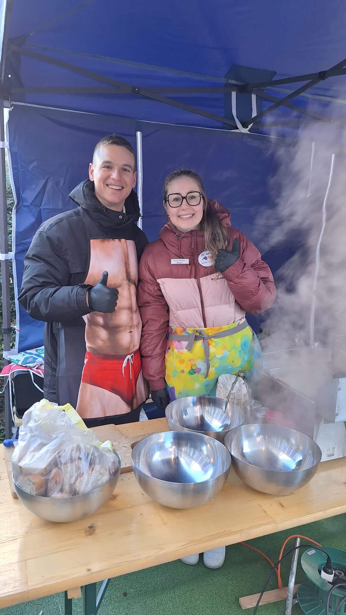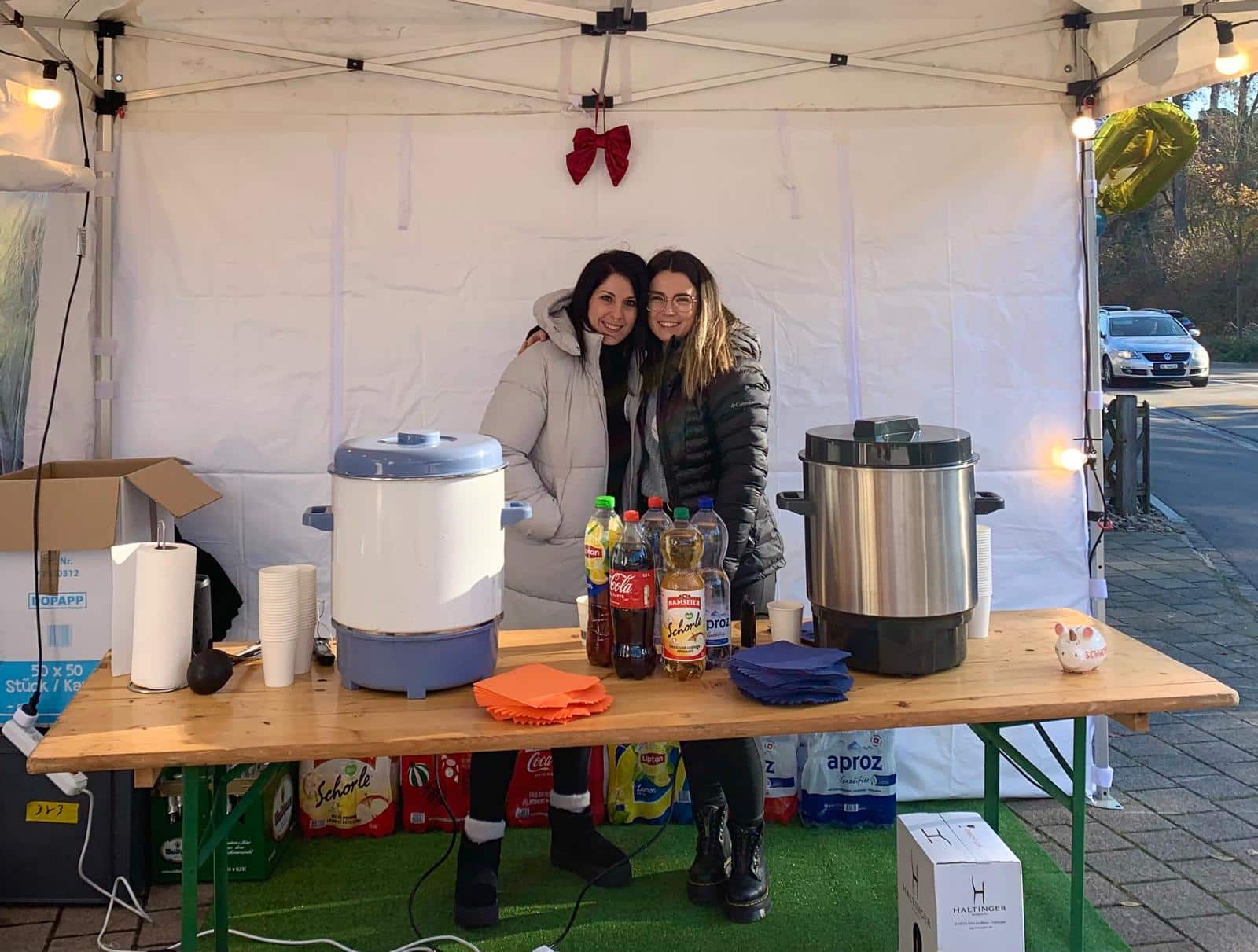 180 Klöpfer, 180 Bratwürste, 30 vegane Würste, 40kg Pommes, 20kg Brot und 75 Liter Glühwein standen parat. Zudem konnten wir ein imposantes Kuchenbuffet präsentieren: über 25 selbstgemachte Kuchen, Wähen und andere süsse Leckereien wurden von unseren Mitarbeitenden mitgebracht.